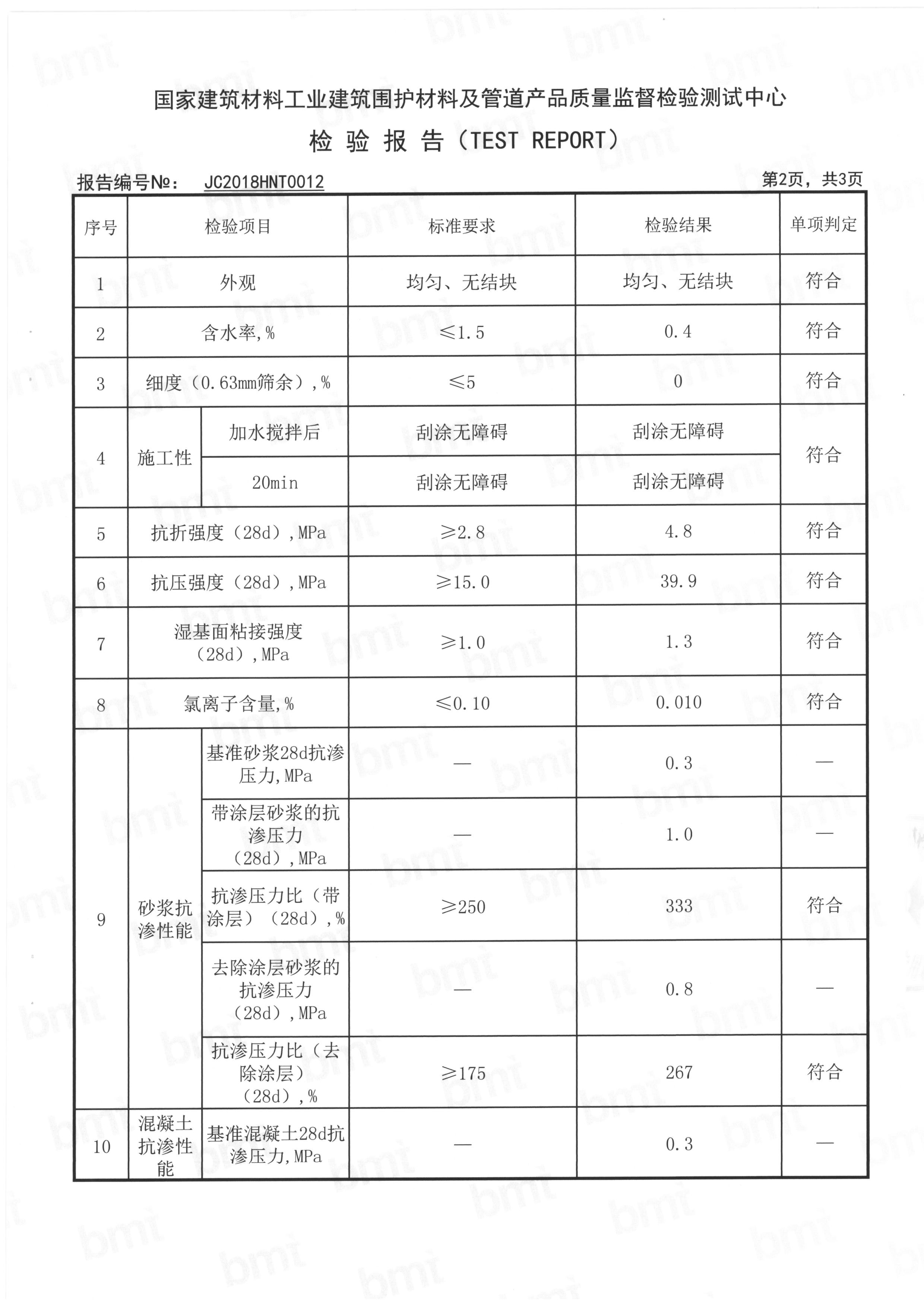 水泥基渗透结晶防水材料是一种刚性防水材料,与水作用后,材料中含有的活性化学物质通过载体向混凝土内部渗透,在混凝土中形成不溶于水的结晶体,填塞毛细孔道,从而使混凝土致密,起到防水作用