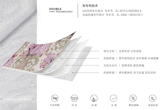 ——JCC天洋墙布的环保特性,也是它的独特之处在于,它将高科技热熔复合技术运用于家装领域,研发出四层结构的竹炭纤维无缝墙布,用热熔网膜代替传统糯米胶水,创造性地赋予了墙布的绿色环保性,无异味,零甲醛,透气防霉,实现了“不用胶水、熨贴上墙”等系列创新,解决了家装的环保问题。