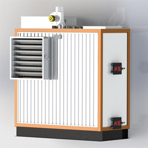 主要工作过程:燃煤在炉膛内产生高温烟气,在引风机的作用下进入烟道循环,与外侧的空气进行热交换后,经烟道由烟囱排出,冷空气由鼓风机吹入热风炉风道,经炉顶流入炉膛外侧空气环,由热风出口管道供给需干净热风的设备。整个工作过程全程正压运行,优点不会出现串烟情况导致用户造成间接性经济损失。
